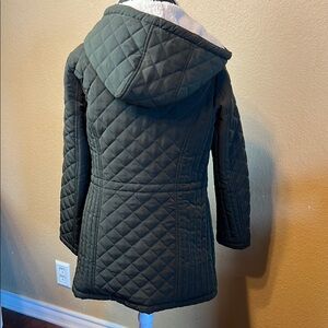 Stay warm and stylish with this elegant quilted dark green coat with gold hardware. Perfect for chilly days. Excellent, like new condition.
