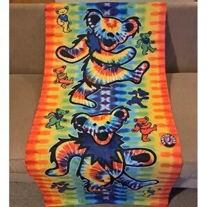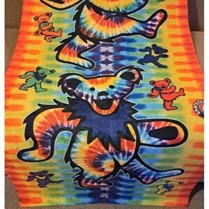 The Grateful Dead collector / enthusiast you know will be happy to receive this brand new and well designed 'Tie Dye Bears' bath or beach towel. The front feels plushy and the back is a white colored more terry feel. The design includes some smaller and some larger Dancing Bear characters on a highly colorful tie dye themed background. We know you will love your new beach towel. Thanks for reading.