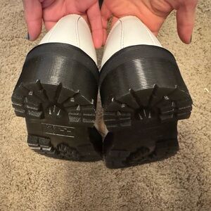 Stylish white leather boots with black laces and yellow stitching. Iconic Dr. Martens design.