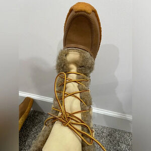 Good preowned condition pair of Sorel Nanook tan leather winter boots with faux fur and rubber with gum soles. Size 6. Lace up. Note some scratches and mild stains as shown in photos. Also note the inner lining is rather pili. See photos for detail and condition. Very warm for the upcoming cold and snowy winter days. Comes from a dog friendly home. Super fun vintage!