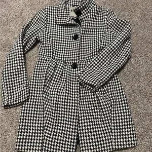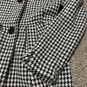 Stylish houndstooth pattern. Classic pea coat design. Perfect for any occasion. The button front closure with the pleated hemline around the waist adds a touch of feminine and offers great warmth. This vintage style coat brings me back to the old times!