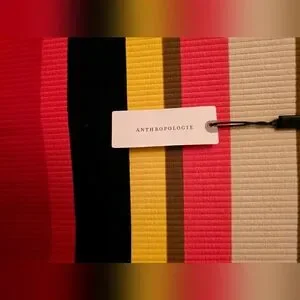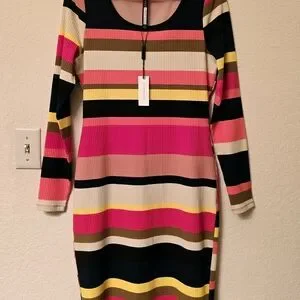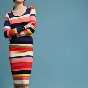 Stylish striped dress by Anthropologie and Tracy Reese. Features vibrant stripes in pinks, navy, brown, yellow, tan and black. Lined. Cotton, spandex, nylon. Hand wash. Dry flat. New with tags.