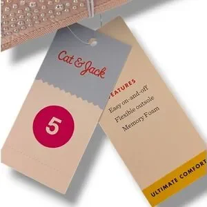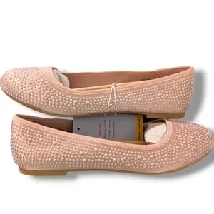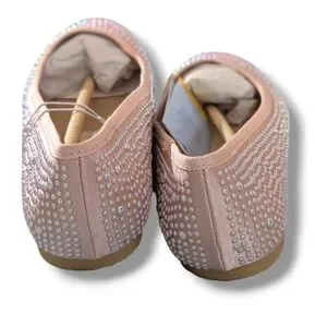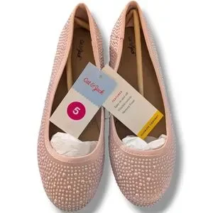 These Cat & Jack dress shoes feature a soft pink hue adorned with shimmering rhinestones, offering a touch of glamour to any outfit. The classic ballet flat design is enhanced by bedazzled sparkly beads providing a subtle decorative flair. Perfect for special occasions, these shoes combine elegance with comfort. Just in time for Easter. 6