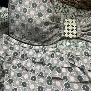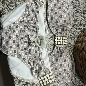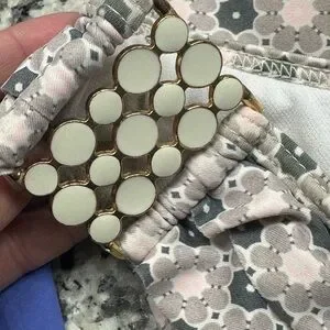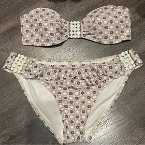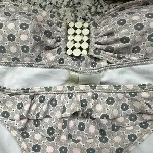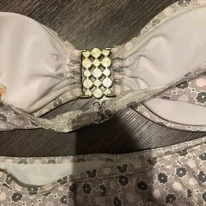 The colors on this unique swim set are super beautiful! Very pale colors: white, pink, green beige. With light gold detail and white enamel hardware on right and left side of bottom and middle detail on the bandeau top.