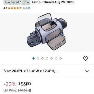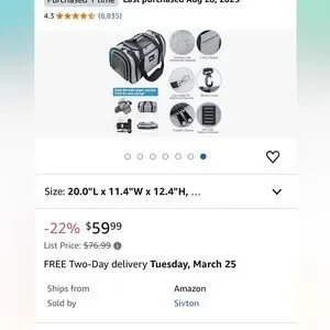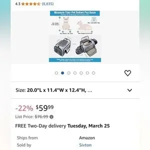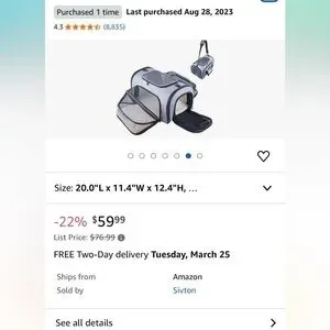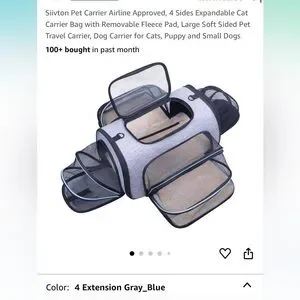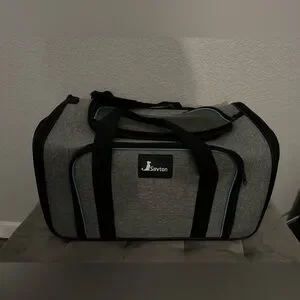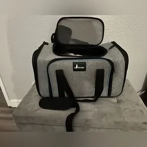 Expandable pet carrier. My dog only practiced in it but never traveled. Only selling because she prefers another one. Item unzips for flat closure for shipping/packing. Dimensions listed are when put together.