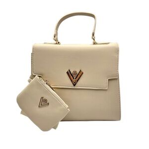This Valentino Orlandi crossbody wallet purse is a medium-sized rectangular handbag with ivory vegan leather strap accents. It features a snap closure, gold hardware, and a lined interior with inner pockets. The ivory exterior is made of rayon and vegan leather, with stylish front and a detachable wallet purse. This piece is lightweight and eco-friendly, perfect for casual, formal, or business occasions $209 Retail