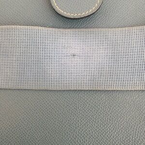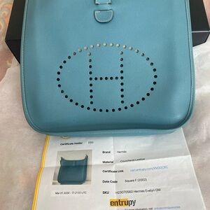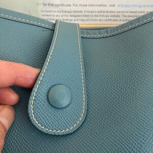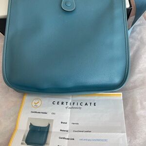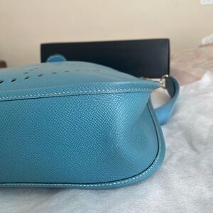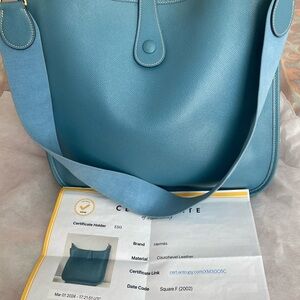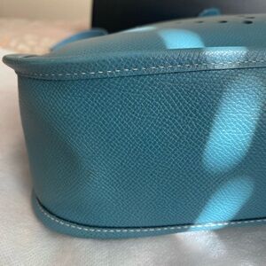 Hemes Evelyn 1 GM( no longer in production. Chourchebel leather, Square F in Blue Jean with Gold Hardware. There is a little tear on the strap( please refer to pic #8). Comes with certificate of Authenticity.