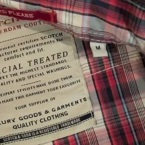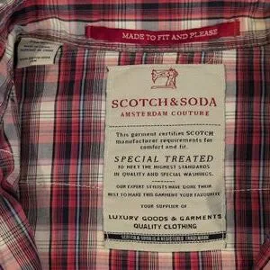 Scotch & Soda Men's Medium Western Long Sleeve Snap Button Down Plaid Shirt. 100% cotton. Spread collar. Chest pockets with snap button closures. Embroidered Scotch Brand Co on chest. Scotch & Soda badge on arm. Red, black, blue, gray and white plaid. Regular fit. Shirt is in excellent used condition. Please see photos for details and measurements. See last photo to see small mark on front button panel.