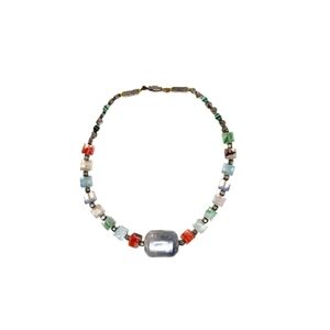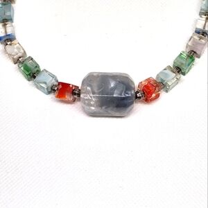This vibrant necklace features a mix of square colorful beads, silver accents, and a large barrel gray bead pendant, perfect for adding a pop of color to any outfit.