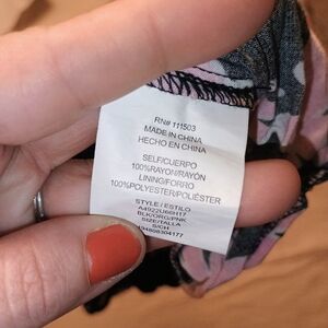 Stylish bodysuit with a vibrant floral pattern. Features pink flowers on a black background. Perfect for a chic look.Even has POCKETS