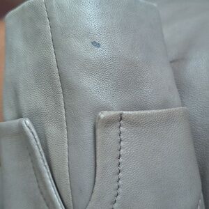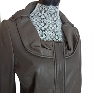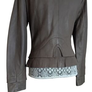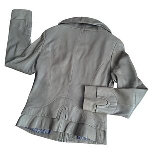Soft genuine leather jacket in small. full front zip closure. Layered peplum style at back fully lined. Jewel neckline. In Taupe colour. Great preowned condition with minimal wear. Measurements laying flat; pit to pit 17" waist 15" shoulder to hem 22" sleeve 24" shoulder to shoulder 15" A
