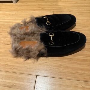 Step into luxury with these Gucci loafers, featuring a sleek black design and plush fur trim. Perfect for adding a touch of elegance to any outfit.