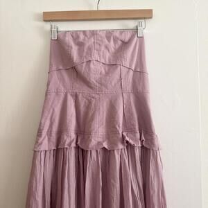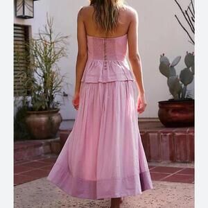 Features: Corset-inspired bodice, strapless design, billowy skirt style, back button-up detail