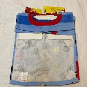 One has a large picture of Mickey with his name at the bottom. The other bib has many smaller pics of Mickey and stars. Made of 100% cotton, and machine washable.