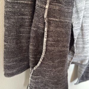 Beautiful Eileen Fisher open cardigan in a women’s large. Dark grey outside with light grey trim and lining. Two from pockets. Made with 100% organic cotton.