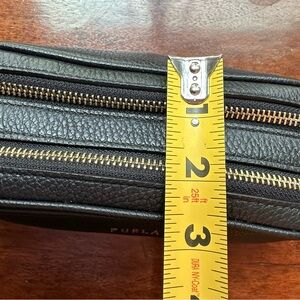 This Furla crossbody bag in timeless black features a sleek oval shape, crafted from premium leather for a refined appearance. Its compact size is ideal for carrying essentials, and the adjustable strap ensures comfort and versatility for everyday use.