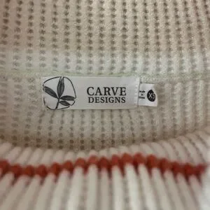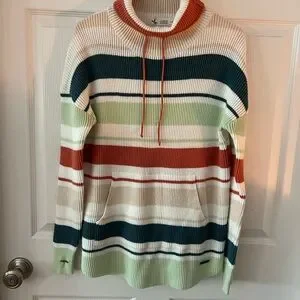 Cozy oversized knit pullover sweater with colorful stripes. Features a drawstring hood and front pocket.