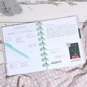 Brand new pregnancy planner undated. Notebook with a vibrant floral design on a blue cover. Features white, pink, and green accents.