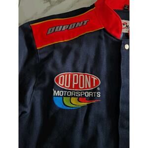 Vintage DuPont NASCAR Jeff Gordon 24 Flames 2001 Jacket Champion JH Chase Size M. This jacket is a must-have for any NASCAR fan. It features the iconic Jeff Gordon flames design and is made of high-quality cotton. The jacket is officially licensed and made in Korea. The unisex design makes it a great addition to any fan's collection. The jacket is size M and has a multi-color design. It's perfect for chilly race days or casual wear. Get yours today and show your support for the legendary Jeff Gordon.