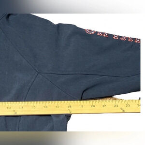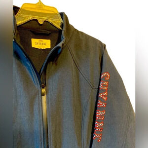 Navy blue zip up jacket by SHYANNE size small. Sleeve is branded with name stitched in red with white stars. Very patriotic!