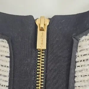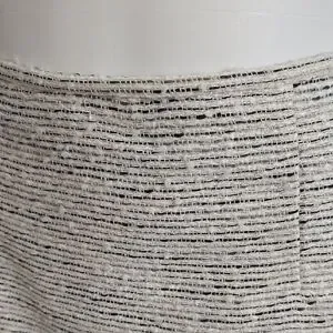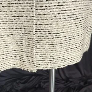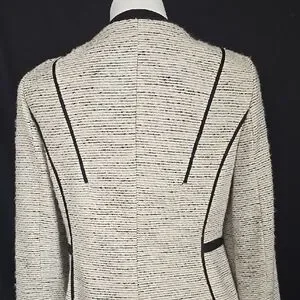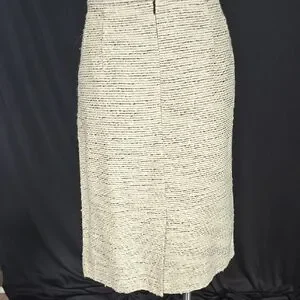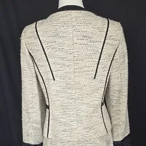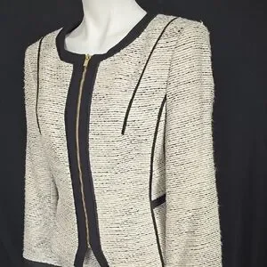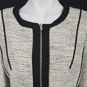 Elevate your work wardrobe with this Calvin Klein suit, featuring a sophisticated cream and black color palette. The zippered jacket with black trim and crew neck design offer a refined touch, while the sheath style ensures a sleek and polished look for any professional setting. Jacket: Armpit to Armpit - 21 inches. Length is 24 inches. Skirt: Waist is 36 inches. Length is 24 inches. Excellent condition.