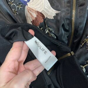 Add a touch of elegance to your wardrobe with this MIULIFE beaded floral bird bomber jacket in black. Made from a comfortable cotton blend, this jacket features a stunning floral bird design with beaded accents. Perfect for any occasion, this jacket is ideal for women in a regular size small. The jacket is styled in a bomber jacket design, with a trendy black color that is perfect for any season. Ideal for women who love to keep it simple yet stylish, this jacket is a must-have in your collection. good preowned condition