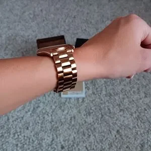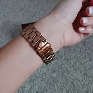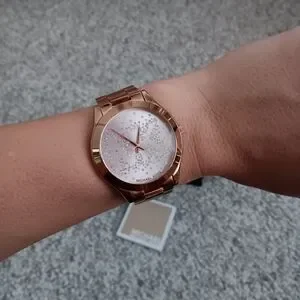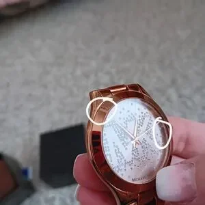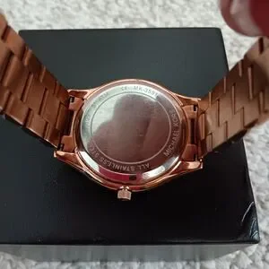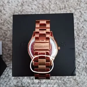 STUNNING Michael Kors slim runway watch. Ultra rare rose gold color with paved crystal MK logo face. New battery, works perfectly! Comes with box and care booklet. Has a scratch on the gold edge of the face and super light hairline scratch on glass (extremely hard to see and capture on camera). It had no extra links when I purchased, so I added 2 more links to the band from one of my other MK yellow gold slim runway watches. One of my favorite styles... so comfortable and lightweight!