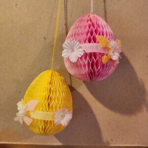 Lovely, 2" long, honeycomb eggs in yellow, pink, blue and white with dainty flowers on a ribbon. These are in excellent condition. All have a string for hanging. In the original box.