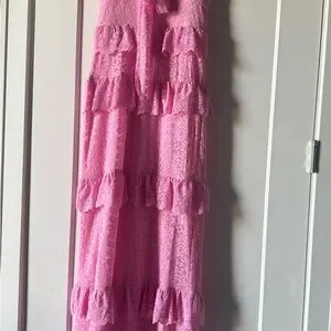 Elegant pink lace dress featuring bow straps. Perfect for special occasions. Only worn once!