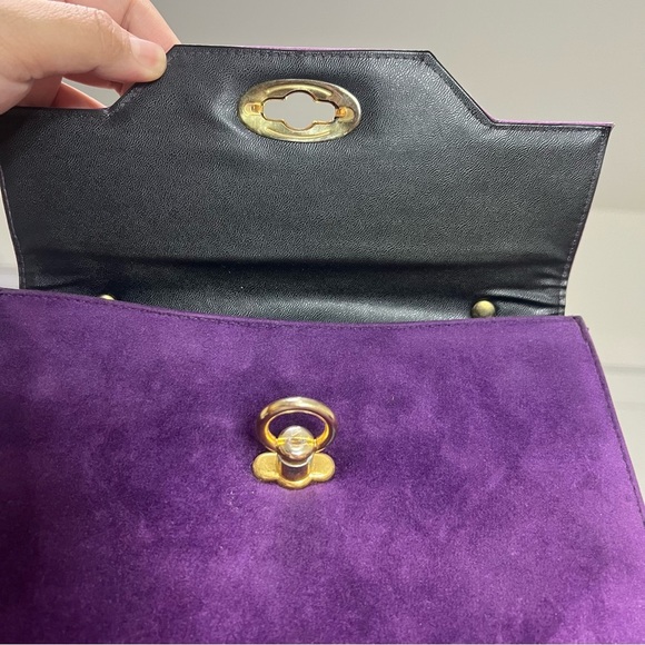 Elegant purple suede handbag with gold accents, perfect for any occasion.