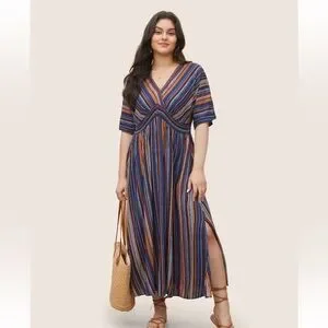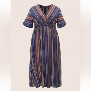 BloomChic Striped Contrast Dolman Sleeve Shirred Pocket Split Flutter Dress