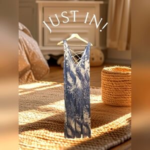 Stylish blue and white Illusions maxi dress. Features a crisscross back design. Perfect for casual outings.