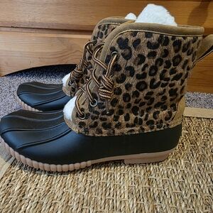 Stylish Marley Lilly leopard print winter boots with lace-up design and faux sherpa tongue. Features a durable black exterior. I have only worn these shoes one time, no signs of wear aside from the sole. size 6