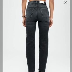 High rise fit sitting right below the natural waist and hitting at the ankle bone. fitted through thigh with a straight leg down to your ankle.
