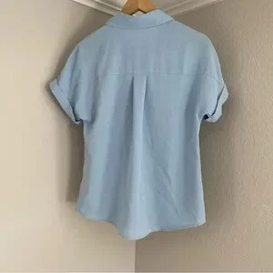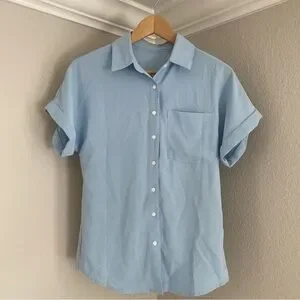 Womens Short Sleeve Shirts V Neck Collared Button Down with Pockets Blue XS