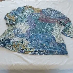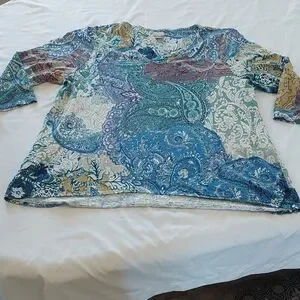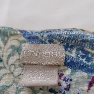 This Chico's blouse features a relaxed fit with a striking graphic design in various shades of blue. The top showcases a comfortable sleeve length, perfect for casual outings. Its intricate pattern adds a touch of elegance to any ensemble.