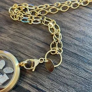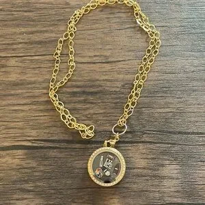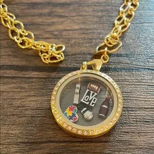 Pretty good plated stainless steel locket with 6 charms. 18” long chain (36”). Signed Origami owl. Charms include: football, autism puzzle piece heart, cola bottle, guitar, and Love. So cute! Excellent, like new condition.