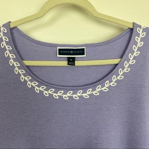 NWT Sz 1X Karen Scott striped purple tee with embossed decorations (not embroidered). No visible flaws.