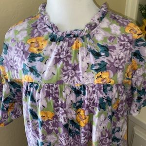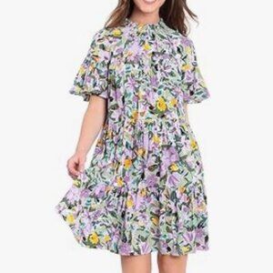 Mock ruffle neck, keyhole at center back neck with button, short sleeves with shirred tier, shirring detail at neck, yoke seam, and above the knee skirt tiers.