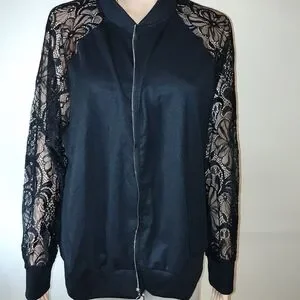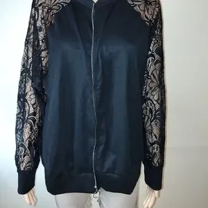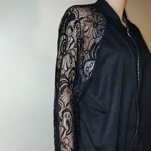 This elegant women's jacket features intricate lace sleeves, adding a touch of sophistication to your wardrobe. Perfect for any occasion, this black jacket combines style and comfort effortlessly.