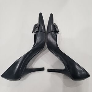 Step out in style with these elegant black leather heels from Nine West. Perfect for any occasion, these shoes offer both comfort and sophistication. Size 8.5 A bit of peeling inside the shoe, see last photo. Does not affect wear.