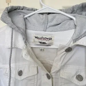 Wallflower “Dreamer" white denim jacket, featuring a white denim body, gray knit sleeves and hood, button-down front, and chest pockets. Versatile and comfortable piece, suitable for various casual occasions. The jacket is made from a blend of cotton, polyester, and spandex. Size small. 17” length and 17” across the front. So this is a junior girls size 14. Excellent condition. No stains or rips and only line dried. Smoke-free pet free home.