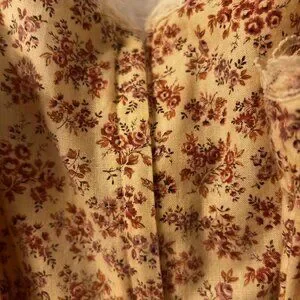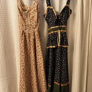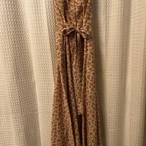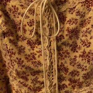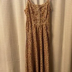 This dress is a rare find. I am the original owner of this dress and absolutely loved wearing it during my early 20's. It is in excellent condition but the right strap in the back will need some minor stitching. This is one of my favorite dresses; it is a soft beige with small pinkish flowers and trimmed with lace. Ties in the front; back zipper and bow ties in the back. Fabric is 100% cotton. Size 7. A very pretty, feminine dress that can be worn casually with sandals for a summer day out with friends or wear with heeled sandals for a special spring/summer evening dinner date.