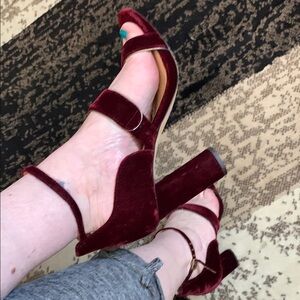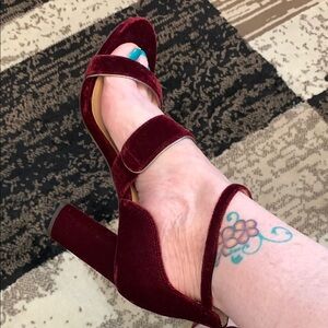 These stunning burgundy heels feature a sophisticated design with multiple thin straps and a high, slender heel. The soft material and subtle platform add comfort and elegance, making them perfect for formal events.