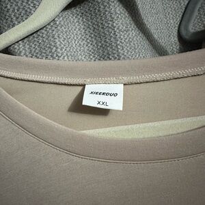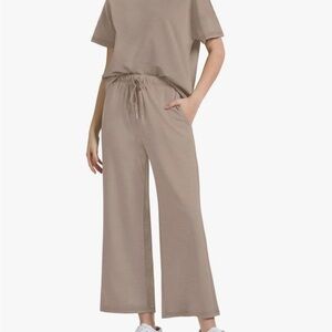 Comfortable beige lounge set with short-sleeve top and elastic waist pants.