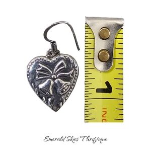 Sterling silver dangle heart earrings in euc. Etched bell design.