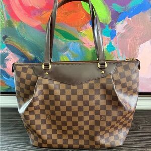 Stylish brown checkered tote bag with elegant leather accents. Perfect for everyday use.
