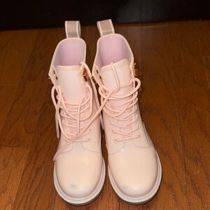 Embrace a chic and edgy look with these Michael Kors combat boots, featuring a soft pastel pink hue and a textured fabric design. The high-top style extends above the ankle, providing a relaxed fit, while matching pink laces complete the cohesive aesthetic. A subtle brand detail on the back adds a touch of elegance to these standout boots.