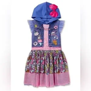 Vibrant dress featuring a blue hood and denim vest. Adorned with playful patches and a colorful skirt.