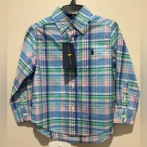This Ralph Lauren boys plaid shirt features a stylish pastel blue, green, pink, yellow and white design. Perfect for spring and Easter! Brand new!